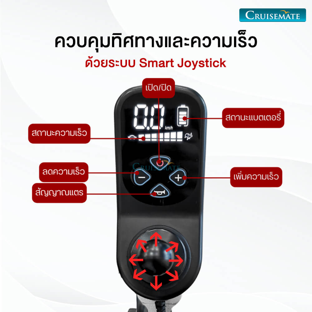 Smart Joystick จอ LED แบบใหม่ล่าสุด ที่ให้การควบคุมทิศทางได้รอบทิศทาง 360 องศา ไม่ว่าจะเดินหน้า ถอยหลัง เลี้ยวซ้ายหรือขวา รวมถึงเคลื่อนเฉียง (เดินหน้า/ถอยหลังพร้อมเลี้ยว) ช่วยให้ผู้ใช้งานบังคับรถได้อย่างแม่นยำและคล่องตัว ยังแสดงสถานะแบตเตอรี่