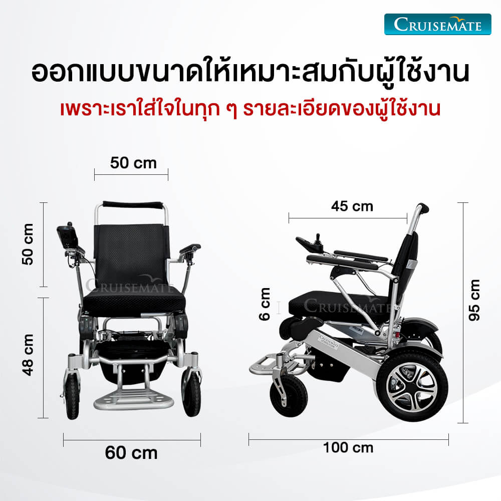 เบาะที่นั่งมีขนาดกว้างกว่ารุ่นมาตรฐานเพิ่ม 6 ซม. (ที่นั่งกว้าง 50 ซม.) เพื่อรองรับผู้ใช้งานที่มีน้ำหนักมากสูงสุดถึง 120 กิโลกรัม แต่ยังคงมีความกว้างวีลแชร์ 60 ซม. ขนาดพอที่จะผ่านประตูบ้านหรือประตูห้องน้ำได้อย่างไม่ติดขัด ความสูงของเบาะจากพื้นอยู่ที่ 48 ซม. ซึ่งเป็นระดับที่เหมาะสมต่อการย้ายตัวจากเก้าอี้หรือเตียง ผู้ใช้งานสามารถเปิดที่รองแขนด้านข้างแล้วเลื่อนตัวขึ้นรถเข็นได้ง่าย จึงช่วยให้การใช้งานสะดวกและปลอดภัยมากยิ่งขึ้น