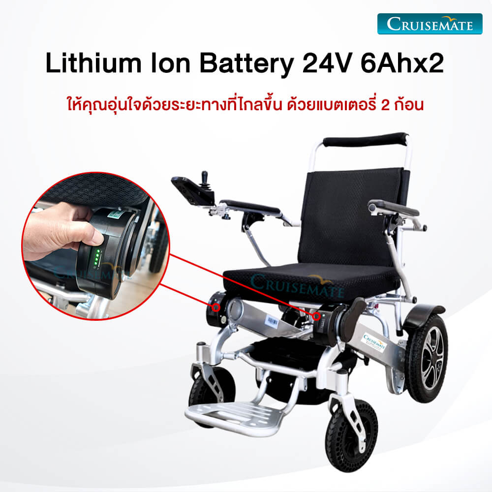 รถเข็นผู้สูงอายุพับได้ น้ำหนักเบารุ่นนี้ ใช้แบตเตอรี่ขนาด 24V 6Ah จำนวน 2 ก้อน ซึ่งมีน้ำหนักเบา ทนทาน และให้พลังงานสม่ำเสมอ สามารถใช้งานแม้มีแบตเตอรี่เพียงก้อนเดียว