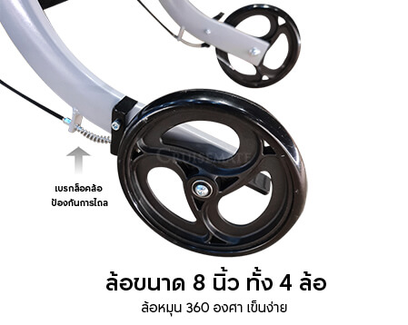 เบรกมือแบบล็อคค้าง – เมื่อต้องการให้รถหยุดนิ่ง ไม่เคลื่อนหรือไถล เพียงบีบก้านสีดำแล้วกดล็อค รถจะหยุดสนิท ช่วยให้ผู้ใช้งานปลอดภัยขณะนั่งพัก หรือหยุดรอ